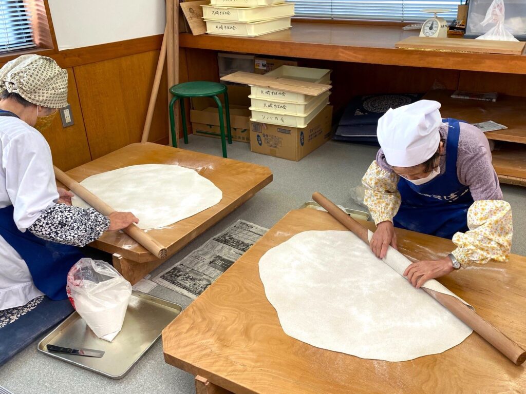 会場の大崎活性化センターの作業場では、慣れた手つきでそば打ちをしています。