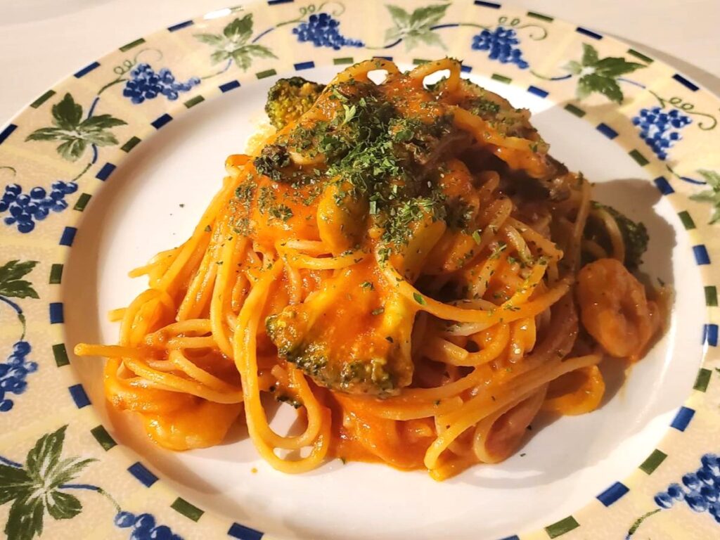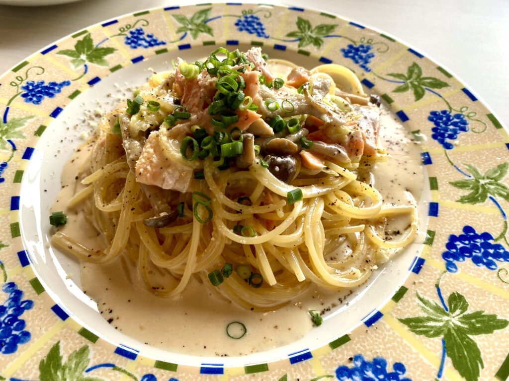 最近話題の佐渡産サーモンとキャベツとキノコの味噌クリームパスタ。